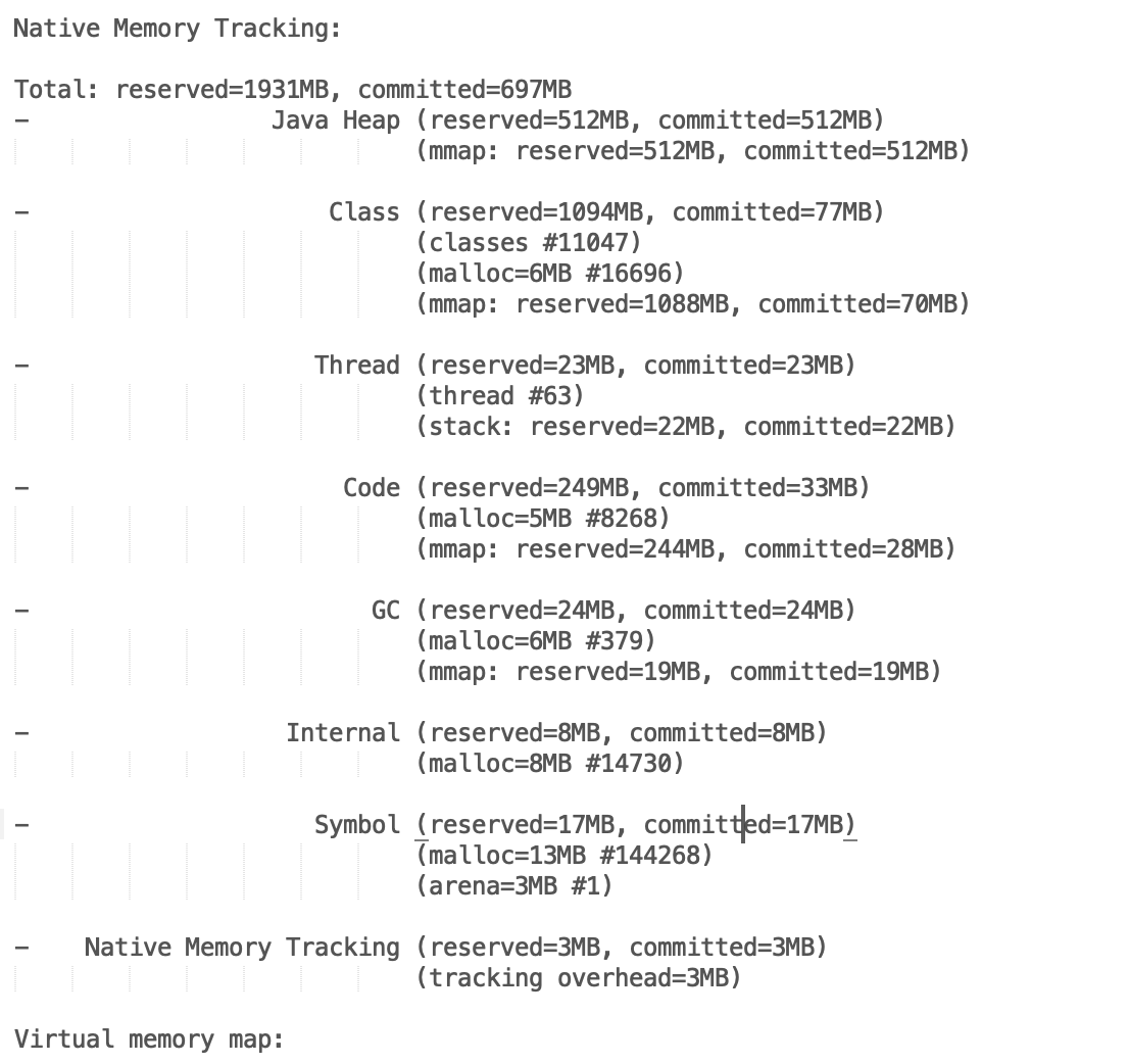 注: -XX:NativeMemoryTracking=必须放在java与-jar之间,如:java -XX:NativeMemoryTracking=detail -jar application.jar